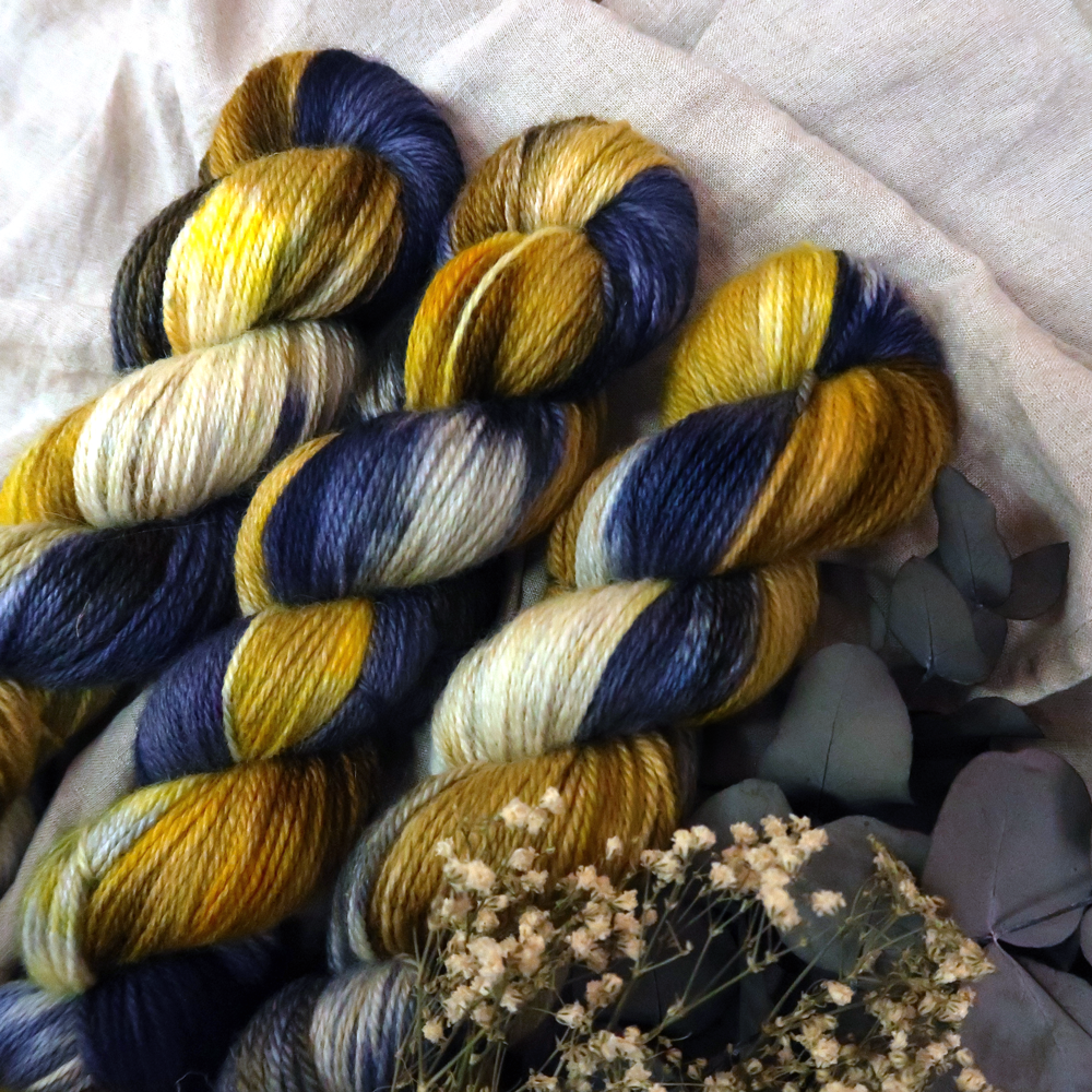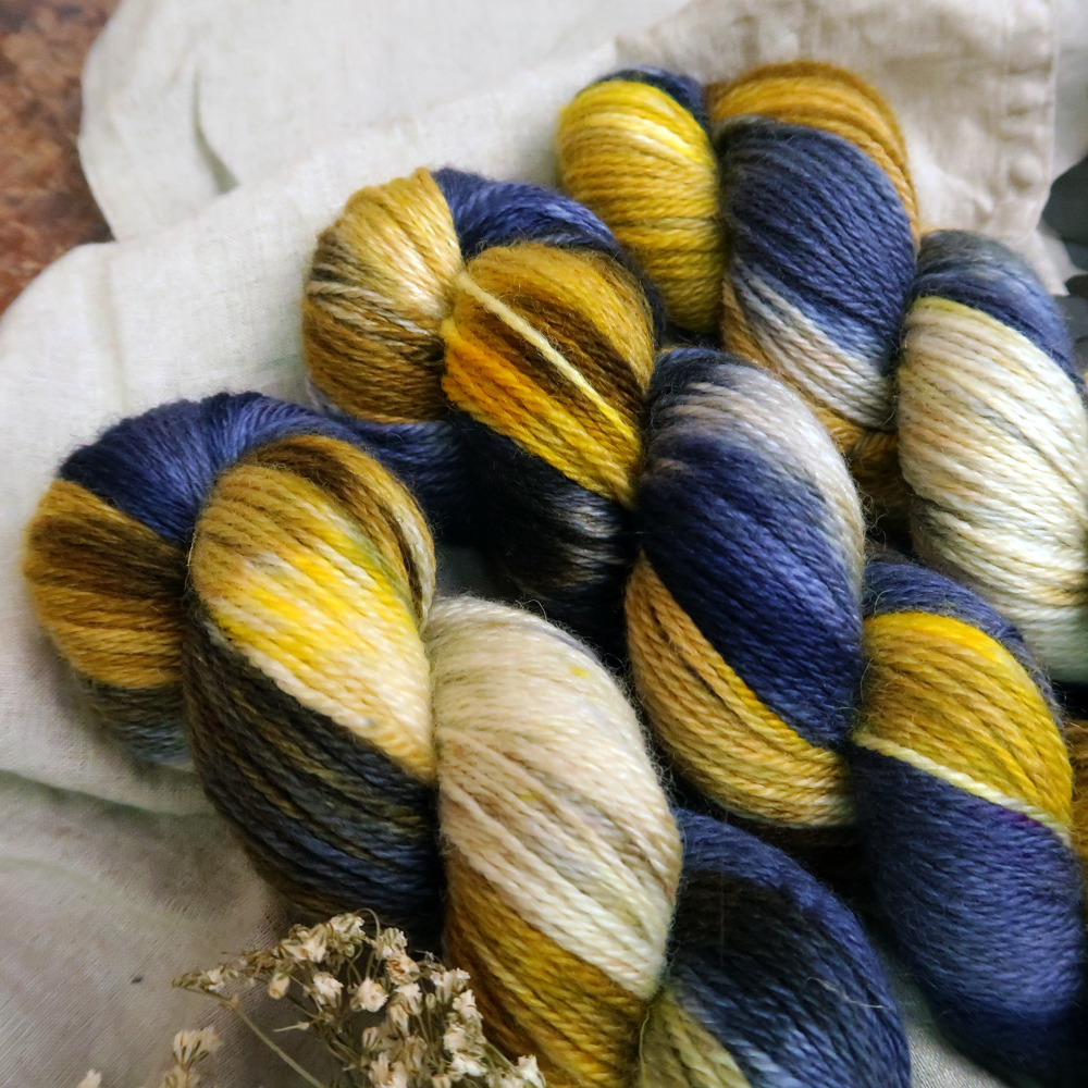 Celestial features a stunning blend of golden yellows and dark royal blues, evoking a starry night sky. This colourway captures the essence of shimmering stars against a deep, midnight blue canvas, offering a cosmic touch to your knitting projects. Perfect for adding a celestial glow to any creation.