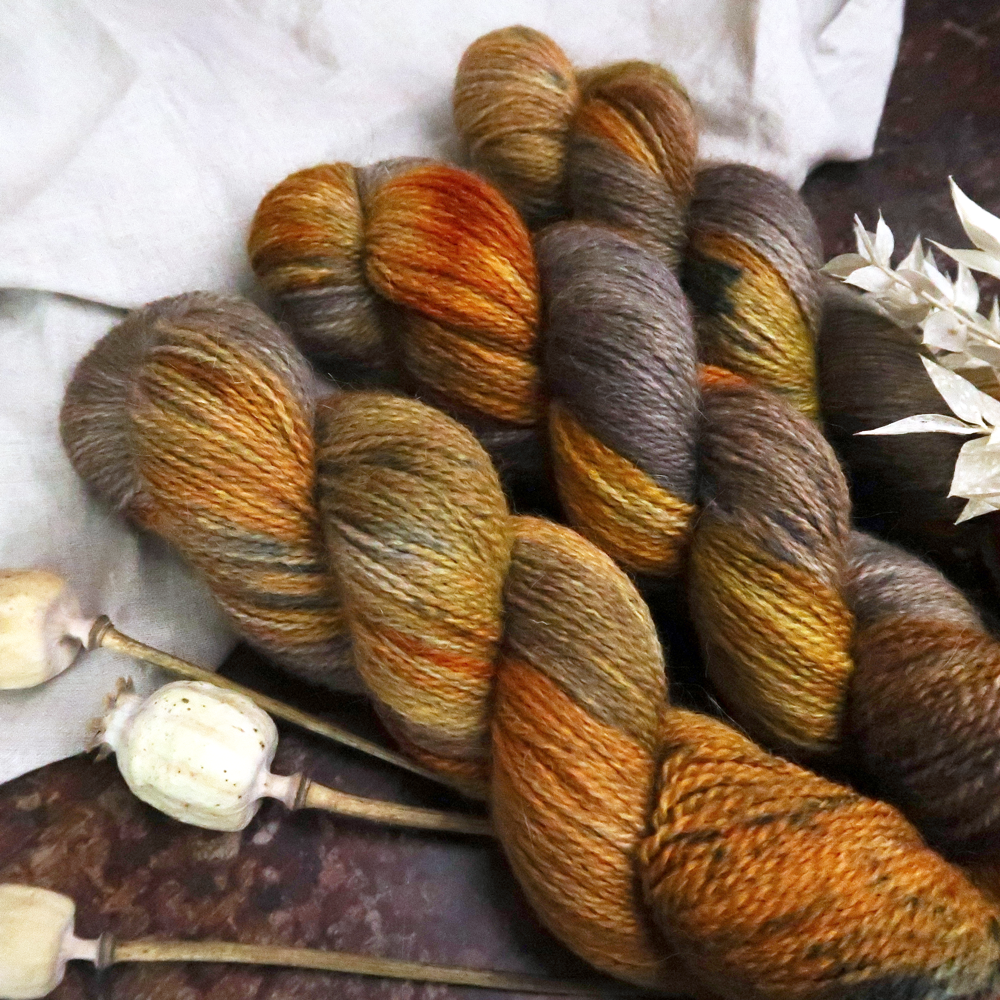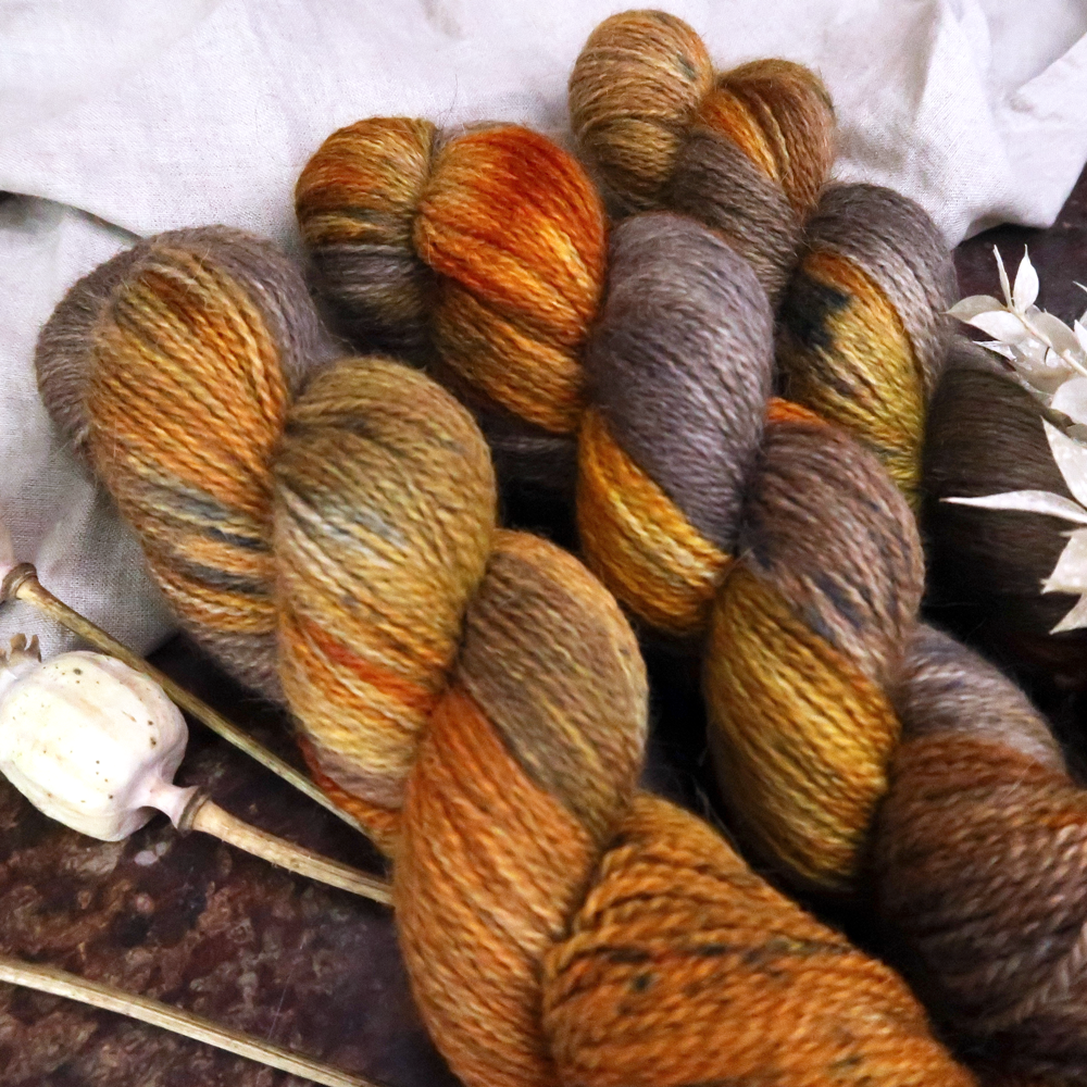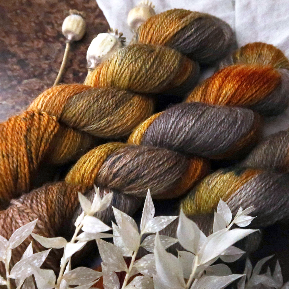 Cosy up with our playful Botanical Apothecary! This hand-dyed fingering yarn has all the colours you need to create something special - orange, purple, and red with a hint of the grey tones from the Shetland wool.