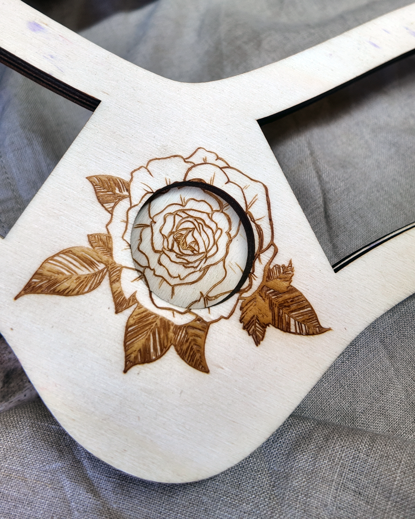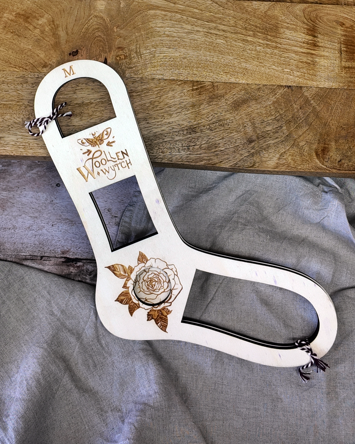 Whether you decide to stain, wax or paint the untreated plywood, or leave it as bare wood, each Sock Blocker has a engraved rose design on one side, because why not have something look pretty and be functional.
