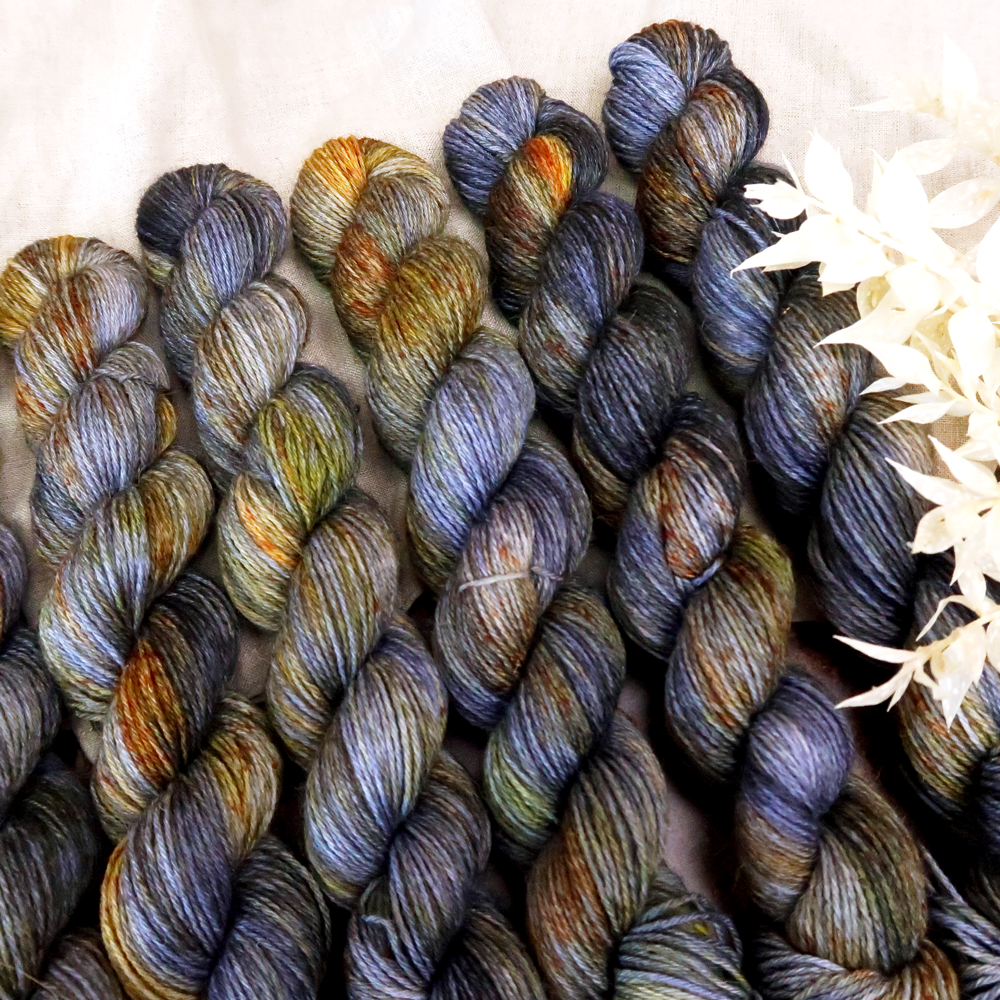 Discover Woollen Wytch's new Yarn base featuring hand dyed BFL, bio-nylon, and alpaca for maximum softness, strength, and warmth.